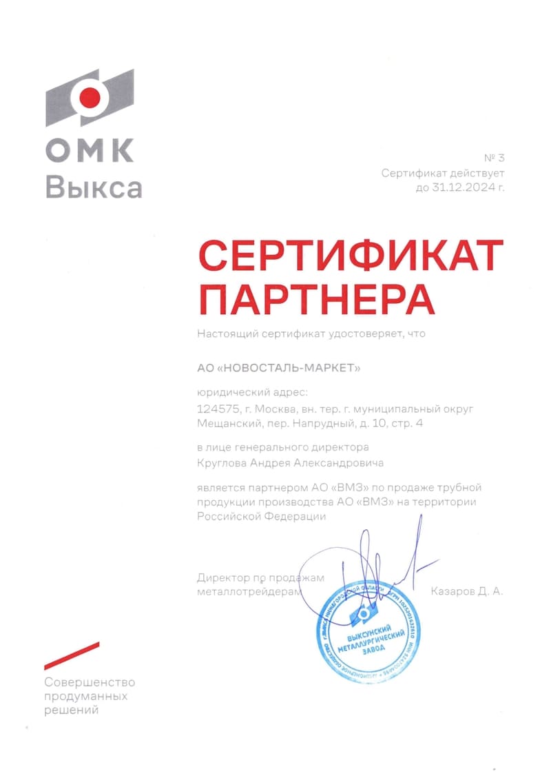 Сертификат дилера АО "ВМЗ" 2024 г.