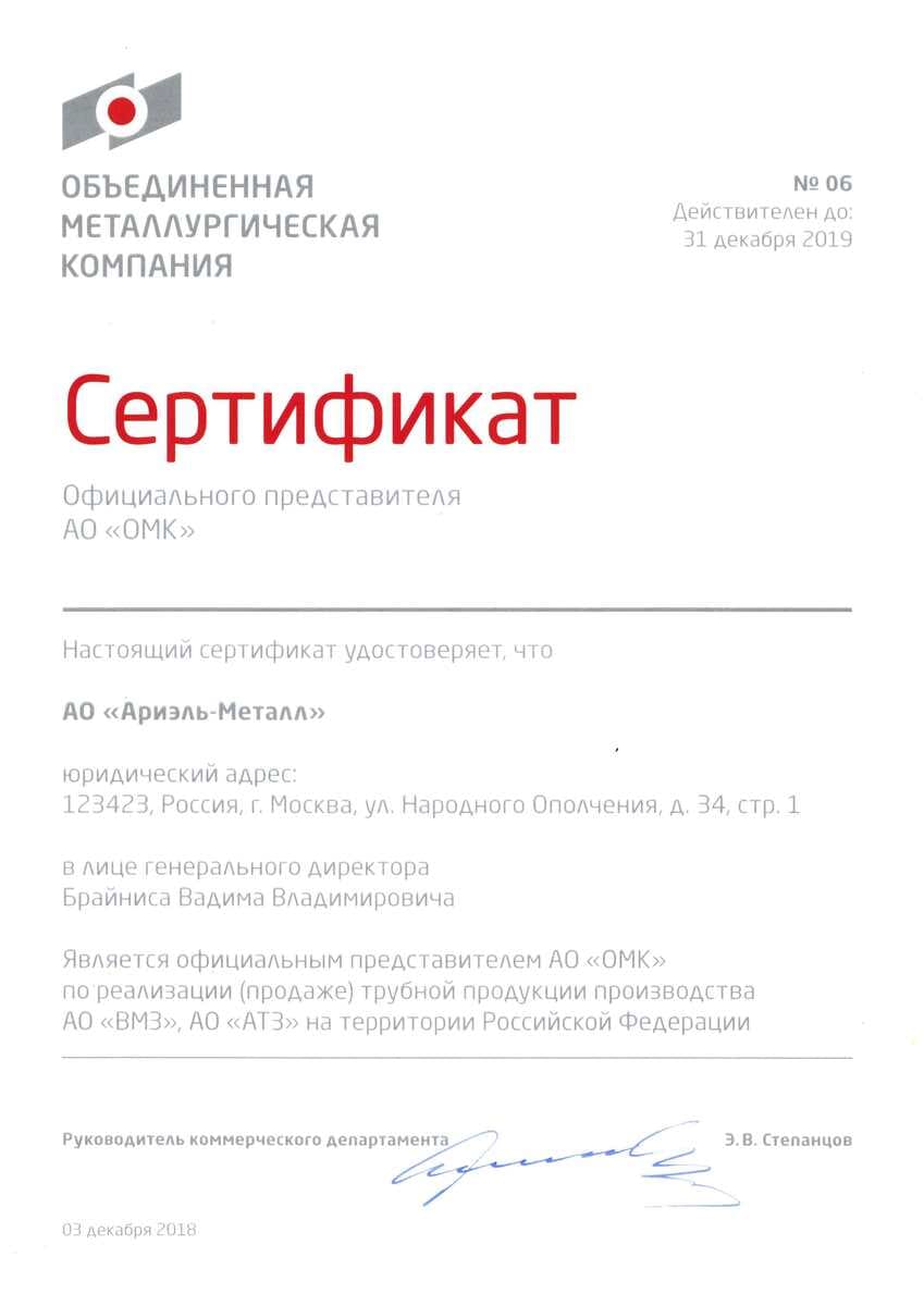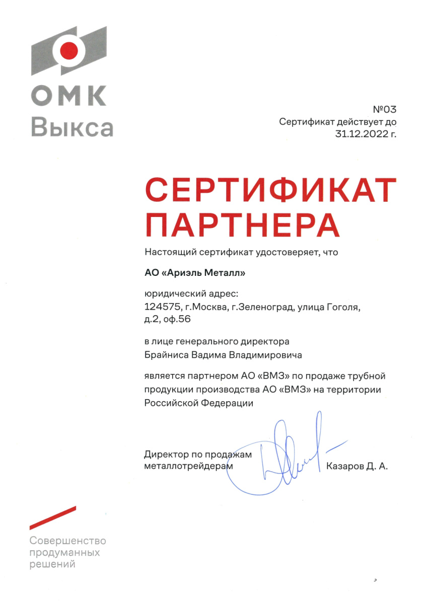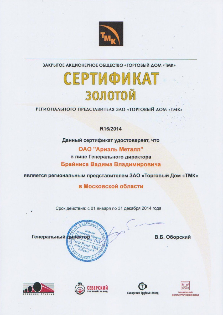 ОАО «Ариэль Металл» является региональным представителем ЗАО «ТОРГОВЫЙ ДОМ „ТМК“ в Московской области